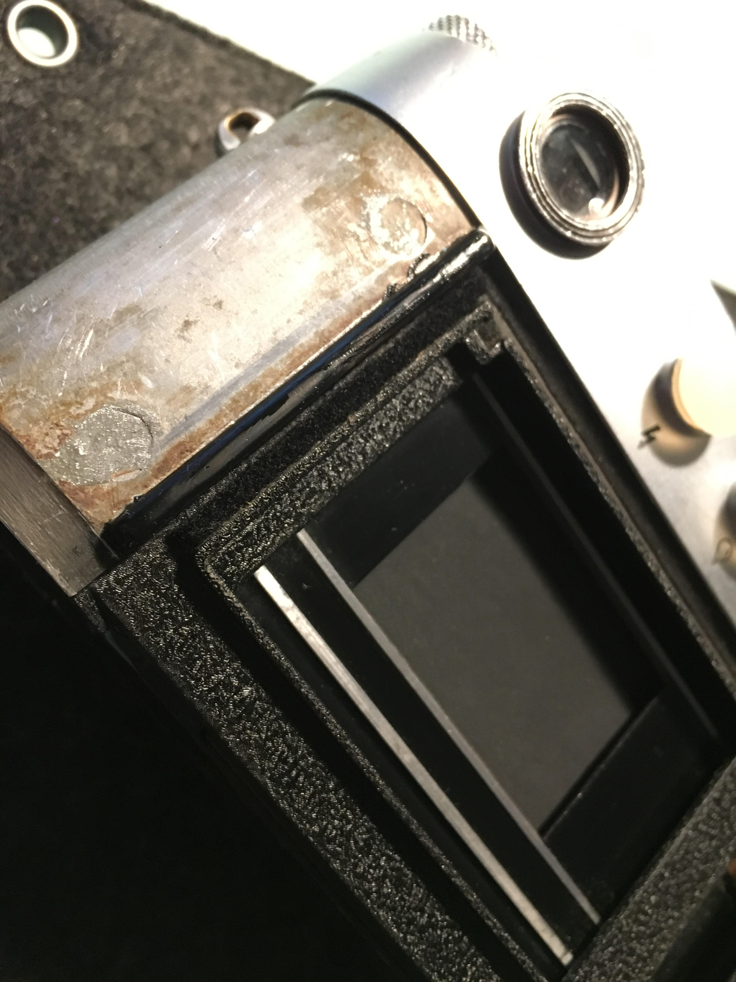 Before starting to re-leather the camera I added some details; repainted the backdoor borders, the metal viewfinder cover, and the small screws at the front.