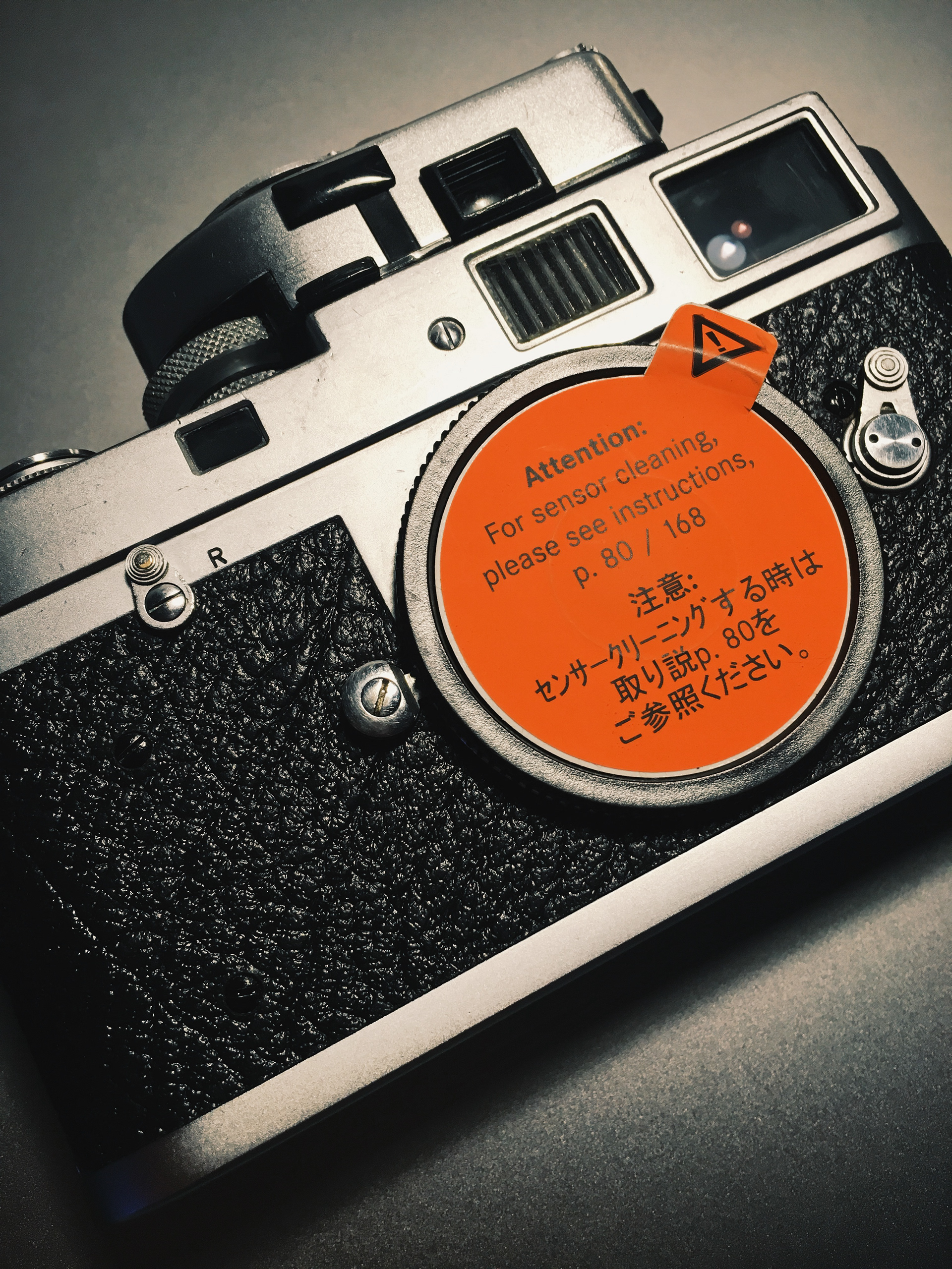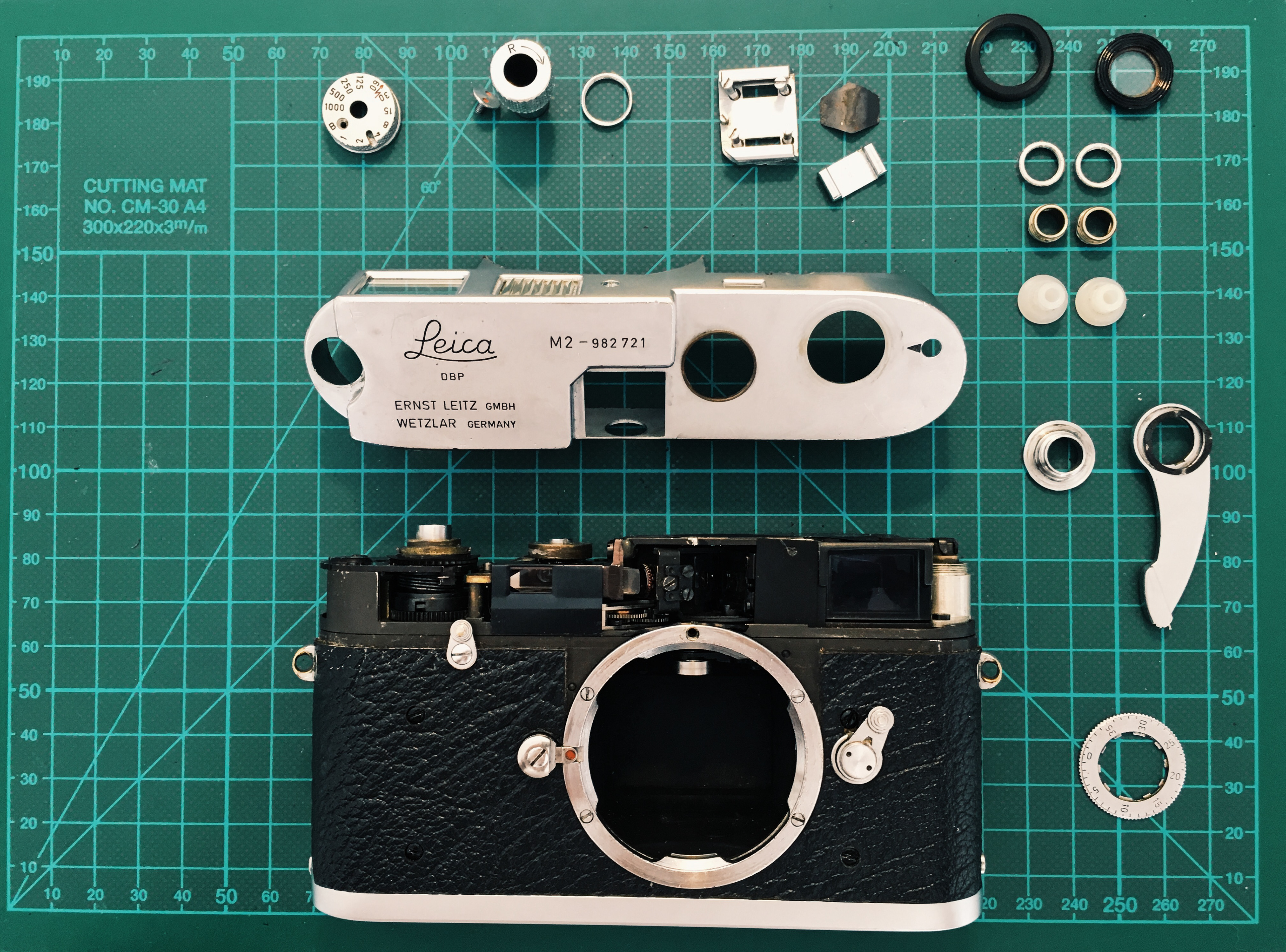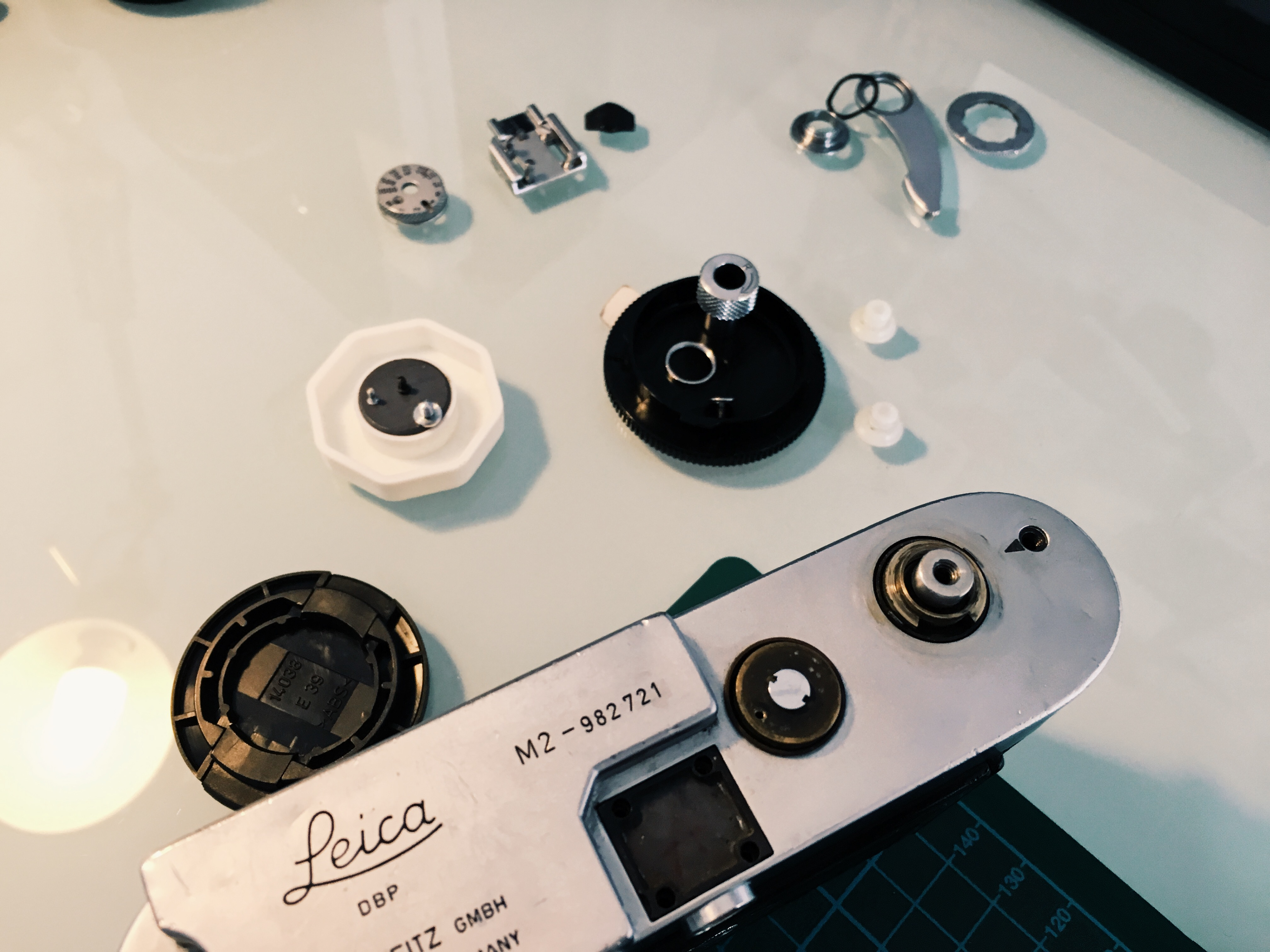 Ok, removing old, hard plastic from a camera isn't as easy as removing the leather from an M9 or else. The vulcanite come of a small pieces, leaving glue back at the camera. Some parts were easy and I just had to look sharp at it to come of, others really were cut from the surface. It took my two hours to remove everything, removing the glue with a scalpel, and cleaning the surface with nail polish remover.